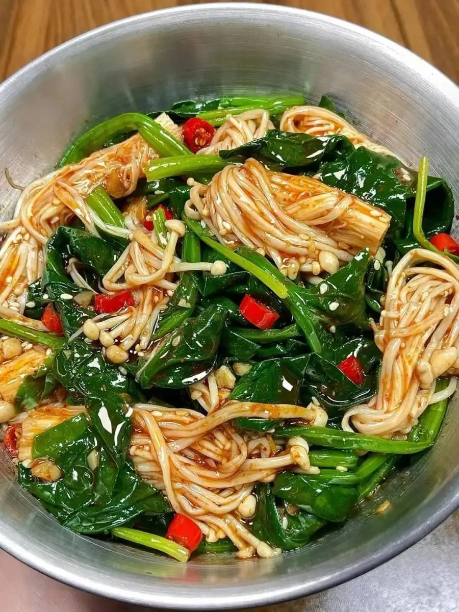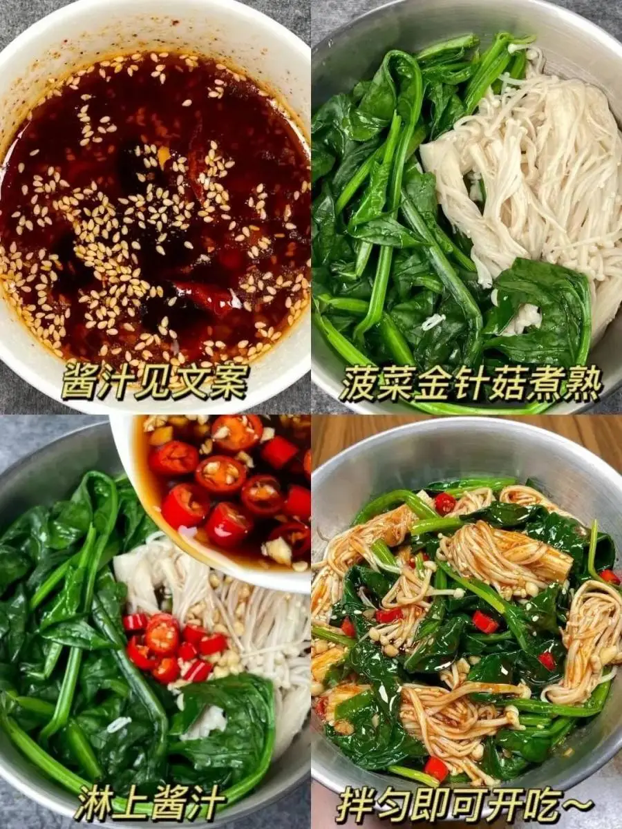 2、菠菜和金针菇放入锅中,倒入适量清水,煮熟捞出,倒入酱汁,搅拌均匀即可开吃。