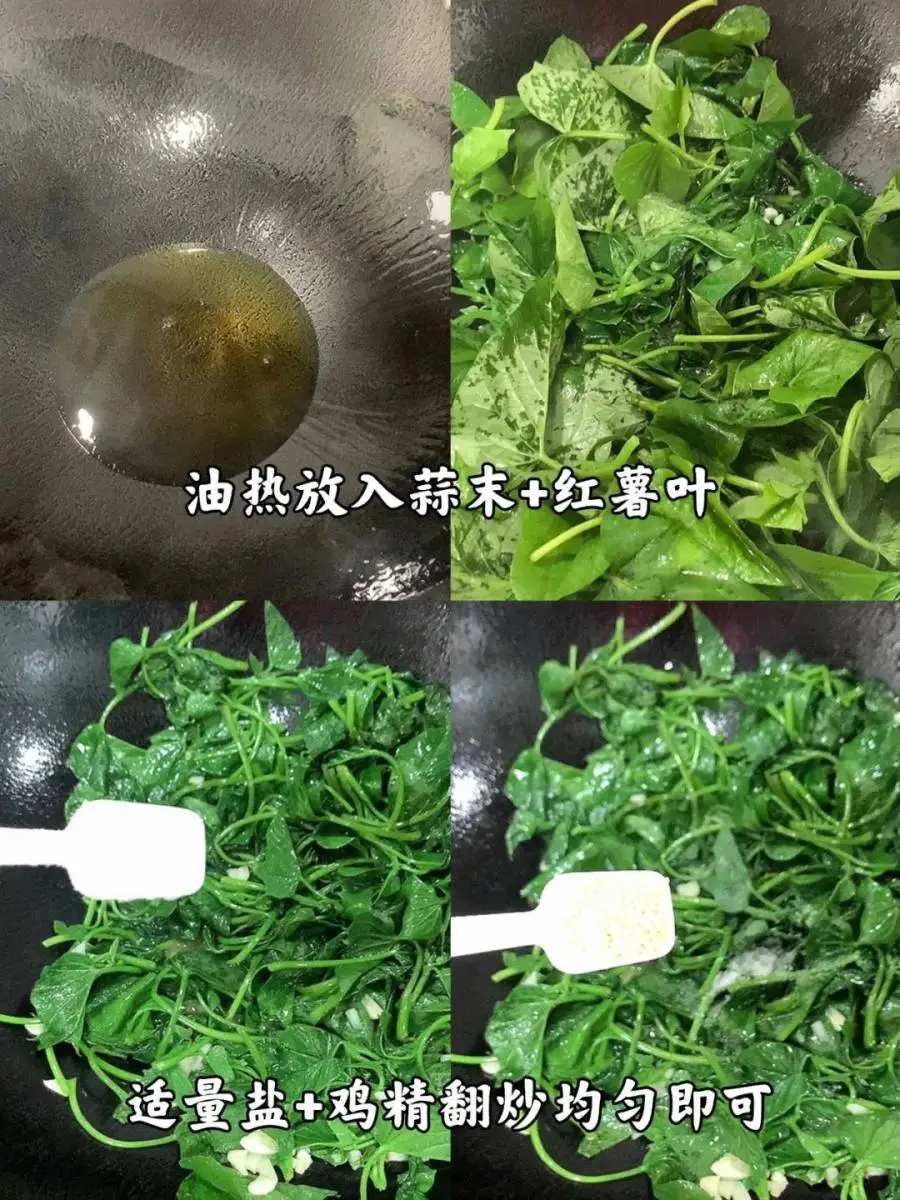2、全程大火爆炒,锅烧到很热油烧到快要冒烟,快速放入蒜蓉后马上下番薯叶翻炒几下,注意蒜蓉不要炸糊了。