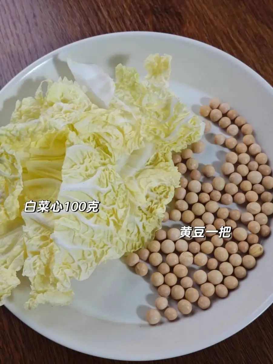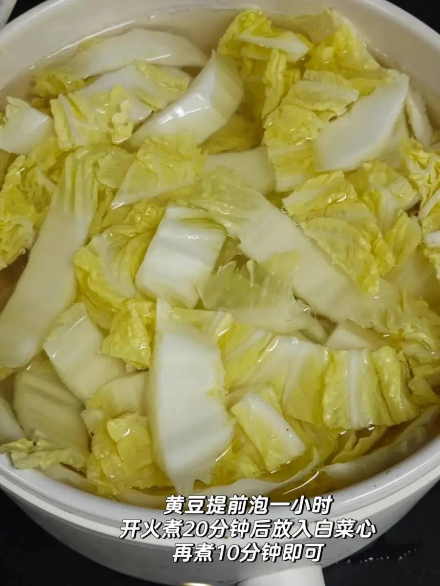 1、黄豆提前泡一小时,加水煮20分钟后,加入白菜心,继续煮10分钟即可