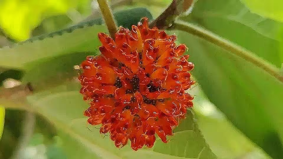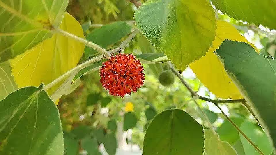聚花果,初为绿色,果熟透变橙红,密密麻麻挂枝头,还是很诱人的,有点甜,能吸引鸟类、蚂蚁等。中医学上称果为楮实子,在《本草纲目》中记载具有补肾清肝、明目利尿的功效,不过据现代研究表明不少敏感人群会有不良反应。